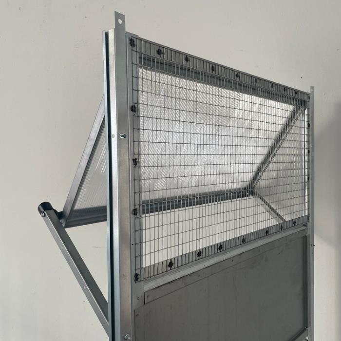 La finestra è apribile in diverse posizioni a vasistas e bloccabile con perno a vite di sicurezza; la finestra ha un pannello di policarbonato neutro in modo da lasciar passare la luce all'interno della gabbia. Tra la struttura del pannello e la finestra vi è una rete antipredatore con maglia 12,5x25mm con filo 1,5 mm.