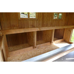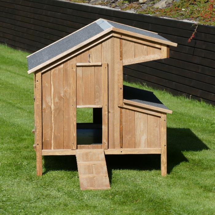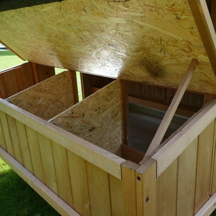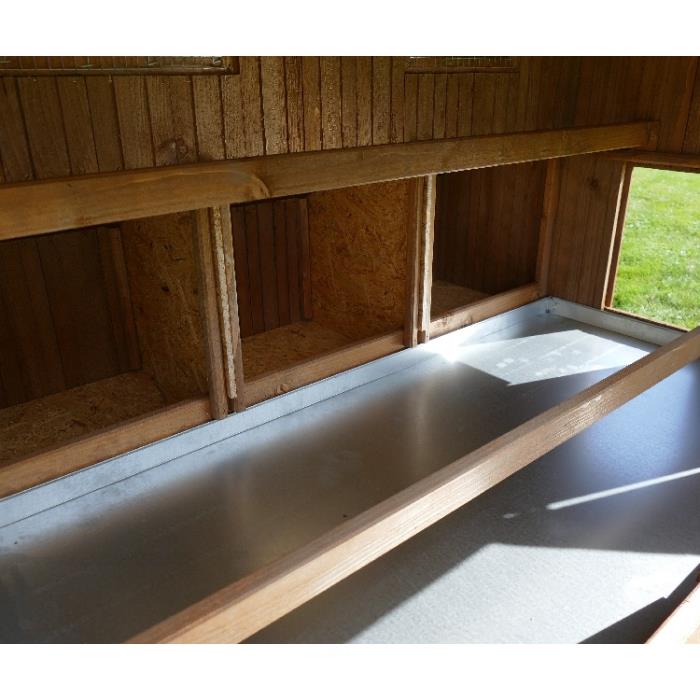 Il pollaio è completo di posatoi e il cassetto per la deposizione è triplo e quindi diviso in tre scompartimenti per dar la possibilità a più galline di deporre nello stesso momento o per poter dedicare un'area per la cova e altri per la deposizione nel caso aveste la fortuna di avere una chioccia all'interno del pollaio.
