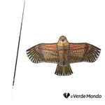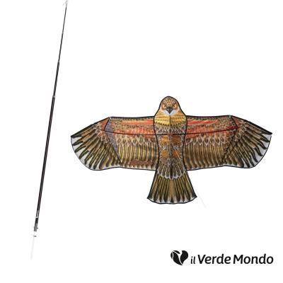 Questo dissuasore volante è ideale per allontanare uccelli dannosi per il vostro giardino e le vostre colture. Questo spaventapasseri con la forza del vento simula il volo di un rapace. La sagoma dell'aquilone rappresenta un falco con apertura alare di 1,75m ed è fissata ad un asta telescopica in 4 parti altezza massima 3,70m.