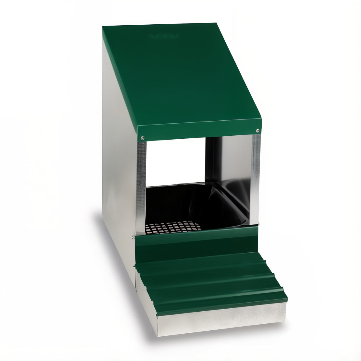 Nido a 1 posto per galline ovaiole con scivolo antischiacciamento e vaschetta per la facile raccolta delle uova. Ideale per essere appeso all'esterno. Fondo e coperchio in metallo, che garantiscono una perfetta igiene della zona di deposizione e/o cova. Il nido va appeso ad un supporto resistente all'interno del vostro allevamento o pollaio.