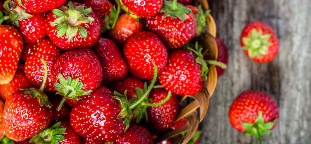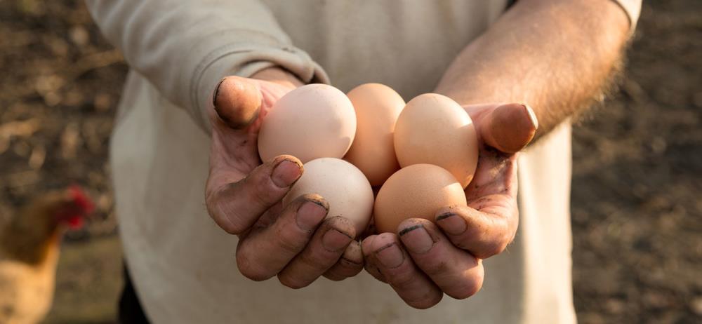 Ernte: Erdbeeren, Sellerie, Salbei, Thymian, Chilischoten, Basilikum, Petersilie, Schnittlauch und Eier.