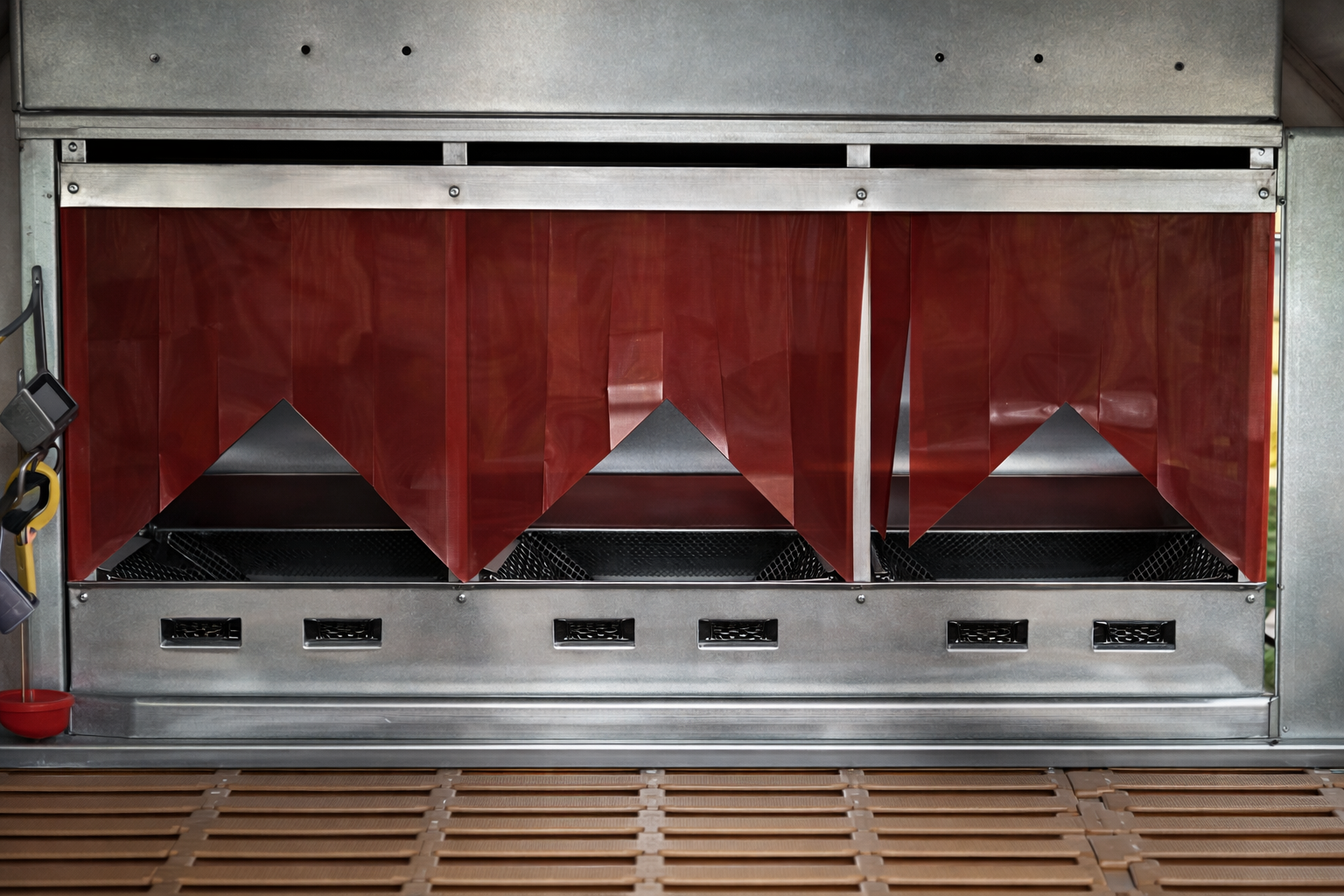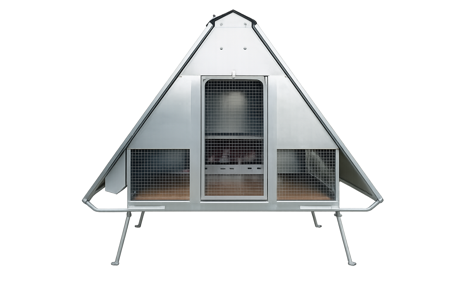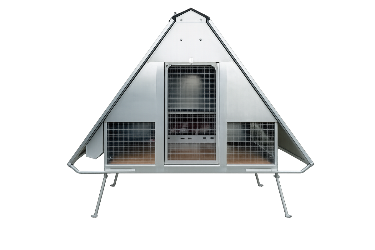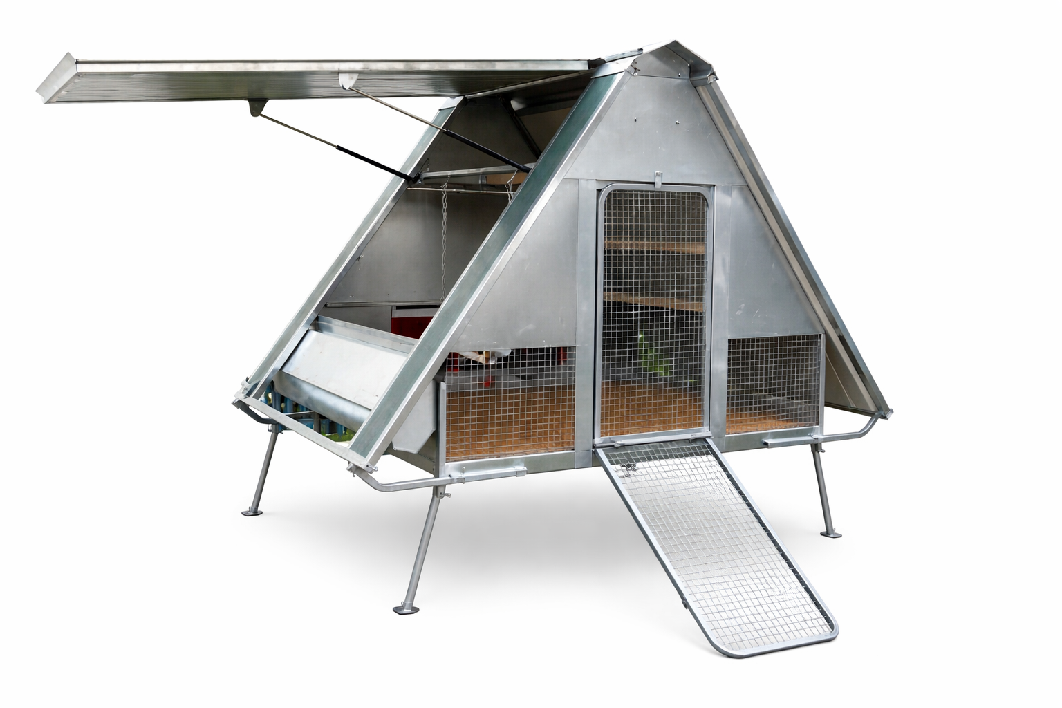 Il pollaio è dotato di tetto coibentato in termoparete con apertura su un lato tramite sistema a vasistas con pistoni ammortizzati. Questa soluzione permette di facilitare le operazioni di manutenzione e migliorare il ricircolo dell’aria all’interno del pollaio.