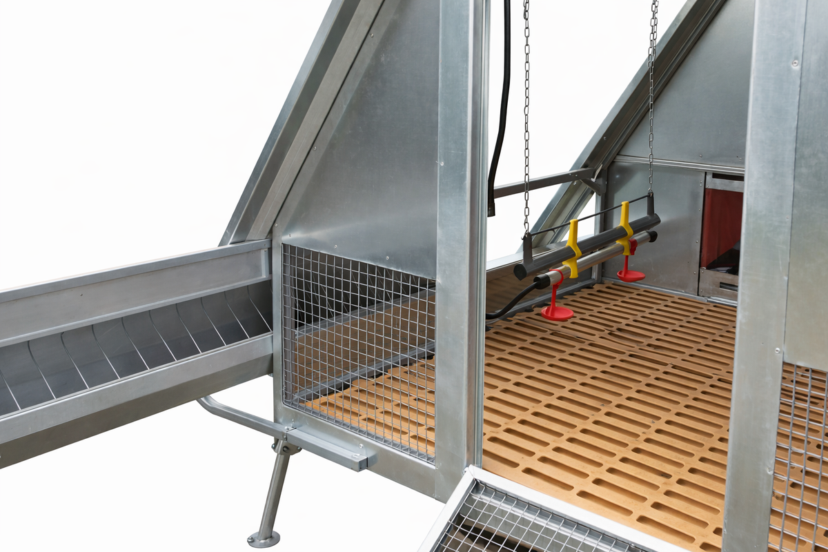 Per la distribuzione del mangime il pollaio è dotato di mangiatoia lineare con griglia antispreco, montata sul lato del pollaio ed estraibile su guida per facilitare la ricarica del mangime e mantenerlo pulito.