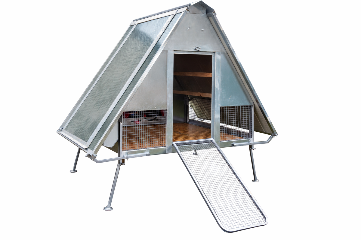 Struttura in lamiera, rete e tubolare di acciaio zincato che garantiscono durabilità e forza per tutta la struttura del pollaio, offrendo protezione dagli agenti atmosferici e una lunga durata nel tempo.