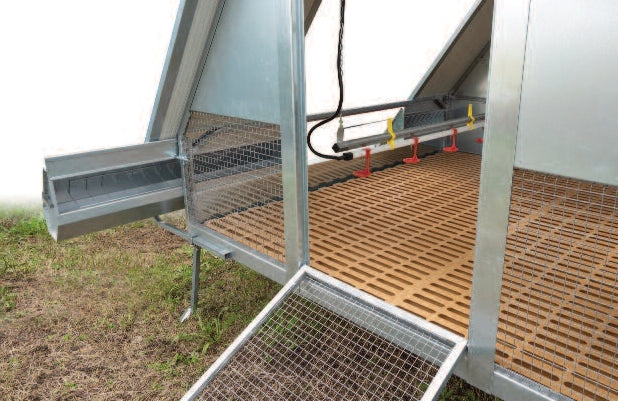 Per la distribuzione del mangime il pollaio è dotato di 4 mangiatoie lineari con griglia antispreco, montate lateralmente alla struttura ed estraibili su guida per facilitare il riempimento del mangime. Questo sistema consente di mantenere il cibo più pulito e ridurre gli sprechi.