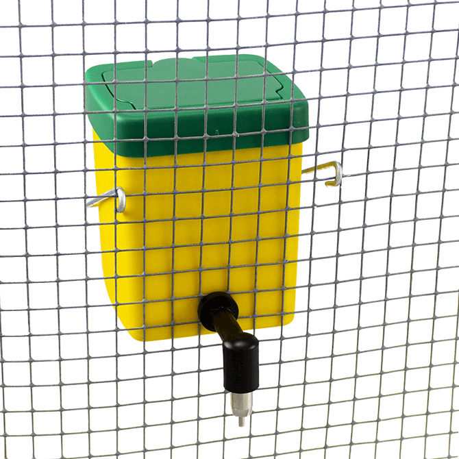 3. Grazie alla staffa di fissaggio potrete appenderlo su qualsiasi gabbia. Se abbinato alle nostre chiocce artificiali potrete posizionarlo sopra alle stesse.