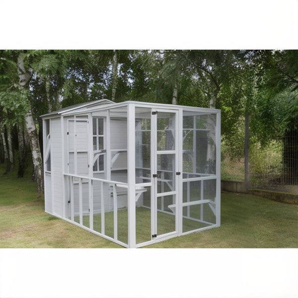 La casetta e il parchetto esterno sono dotati di innumerevoli giochi e distrazioni per l'animale in modo che, oltre a saperlo al sicuro, sia anche attivo e impegnato. La cuccia è completa di ben 14 ripiani differenti. L'interno della casetta comunica con l'esterno grazie a dei bellissimi fori.
