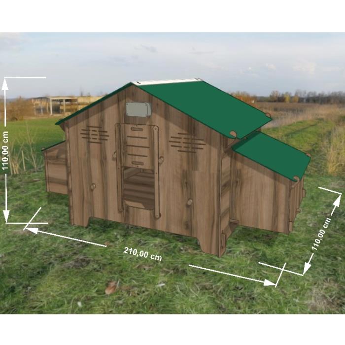 Grazie a questo materiale e al progetto innovativo siamo riusciti ad ottenere un pollaio solido e funzionale che dura a lungo nel tempo e che non ha bisogno di nessun tipo di manutenzione. Può essere utilizzato come pollaio da giardino per l'allevamento di 12-15 galline.