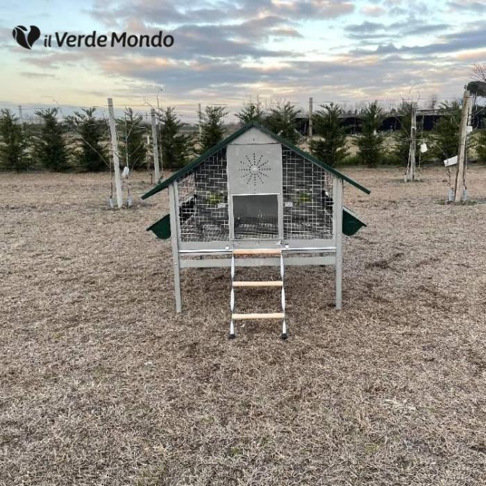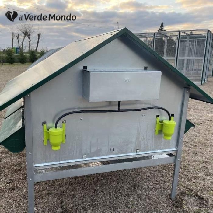 Il pollaio è completo, quindi accessoriato di abbeveratoio (capienza circa 9 litri), 4 mangiatoie (capienza 500gr circa cad.) e posatoio. Mancheranno solo le Vostre cocche.