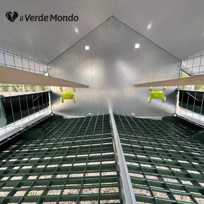 L'interno del pollaio è inclinato e con fondo in plastica. Questo permetterà 2 cose estremamente importanti. 1) che le uova finiranno automaticamente all'interno dei nidi sparsi su tutto il pollaio 2) che le feci delle galline cadranno a terra lasciando il fondo del pollaio sempre pulito.
