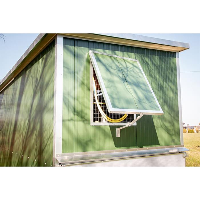 Carrello Omologato per il Trasporto su Strada:Fino a 80 km/h, per un trasporto semplice e veloce, anche in autostrada. Per farlo, basta rimuovere la piccola scala per le galline, sollevare i due supporti, agganciare il pollaio a un veicolo adatto e trainare il rimorchio nel luogo desiderato. Con un po' di pratica, ci vogliono meno di 5 minuti.