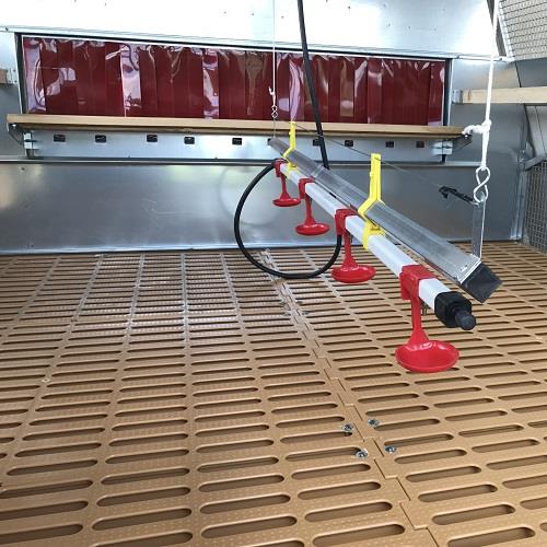 La distribuzione dell'acqua è garantita da 5 abbeveratoi in acciaio inox a 360° i quali sono assicurati ad un tubo con una vaschetta raccogli goccia. All'esterno è alloggiato un serbatoio coperto da un coperchio per alimenti il quale è dotato di un galleggiante da ½.