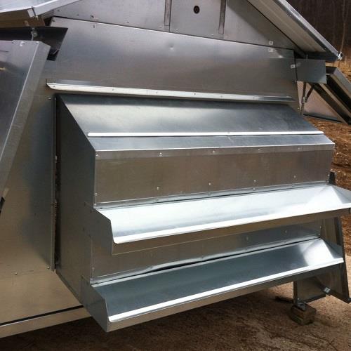 La distribuzione del mangime è assicurata da 2 mangiatoie a tramoggia con coperchio che stazionano in perfetto ordine all'interno.