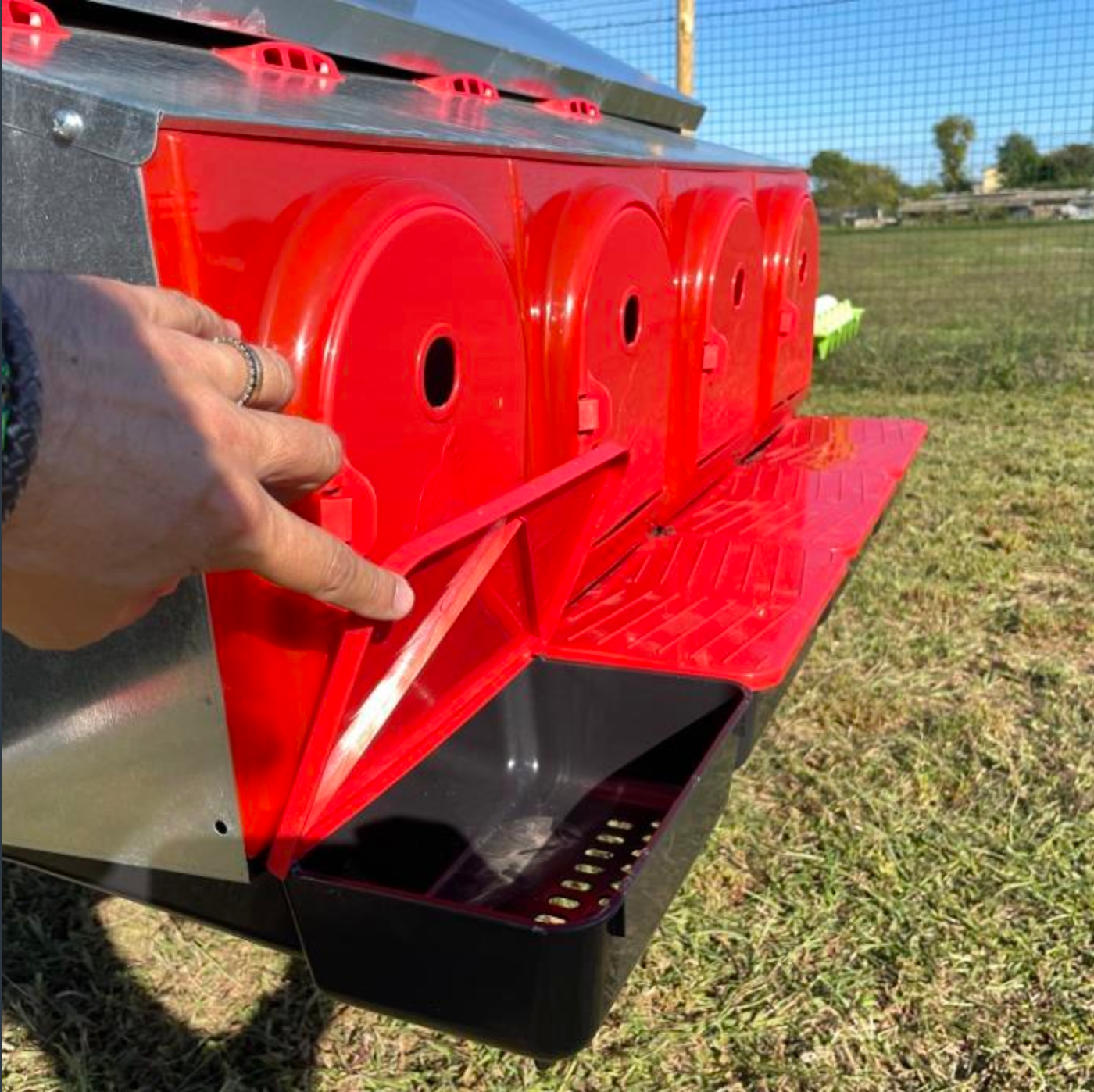 - Per la raccolta delle uova sono predisposti 5 nidi a scomparsa. Il sistema di uova a scomparsa permette di raccogliere le uova comodamente dai vani posti all'esterno.