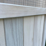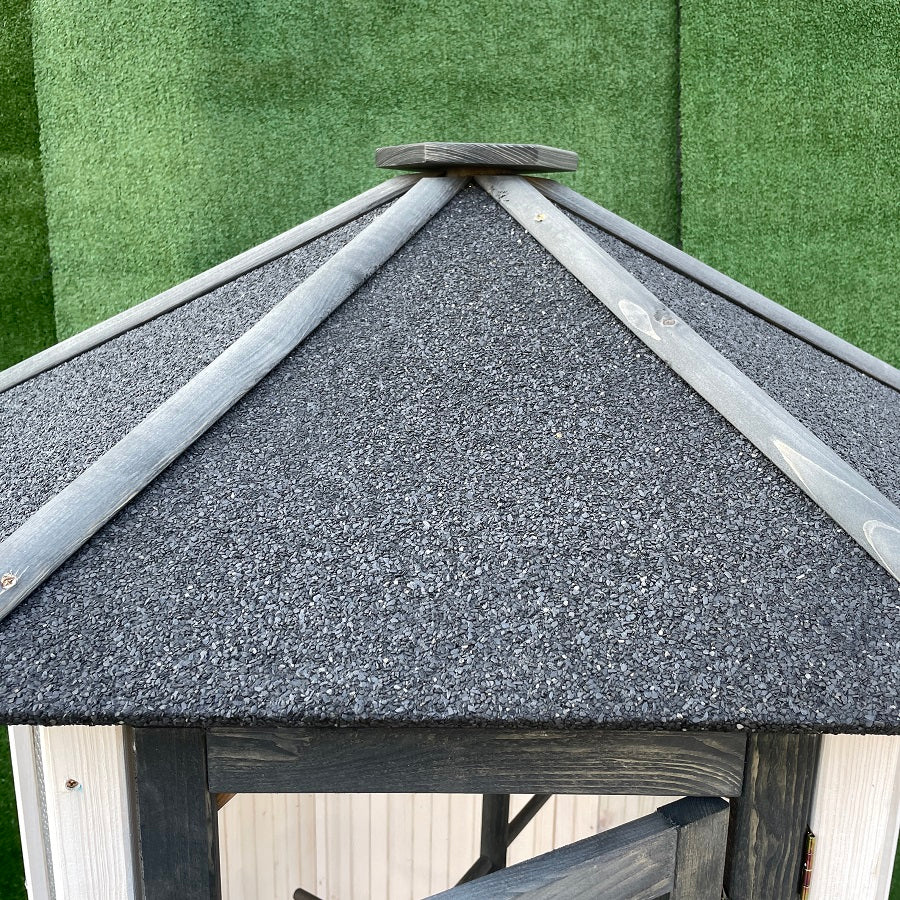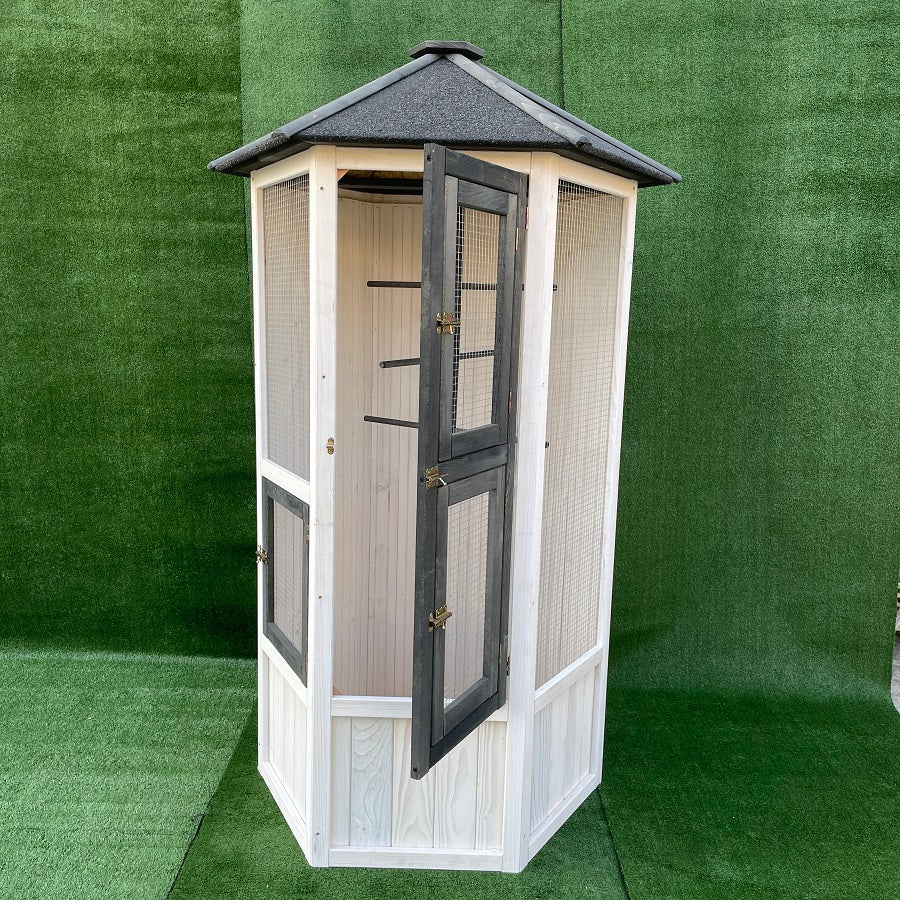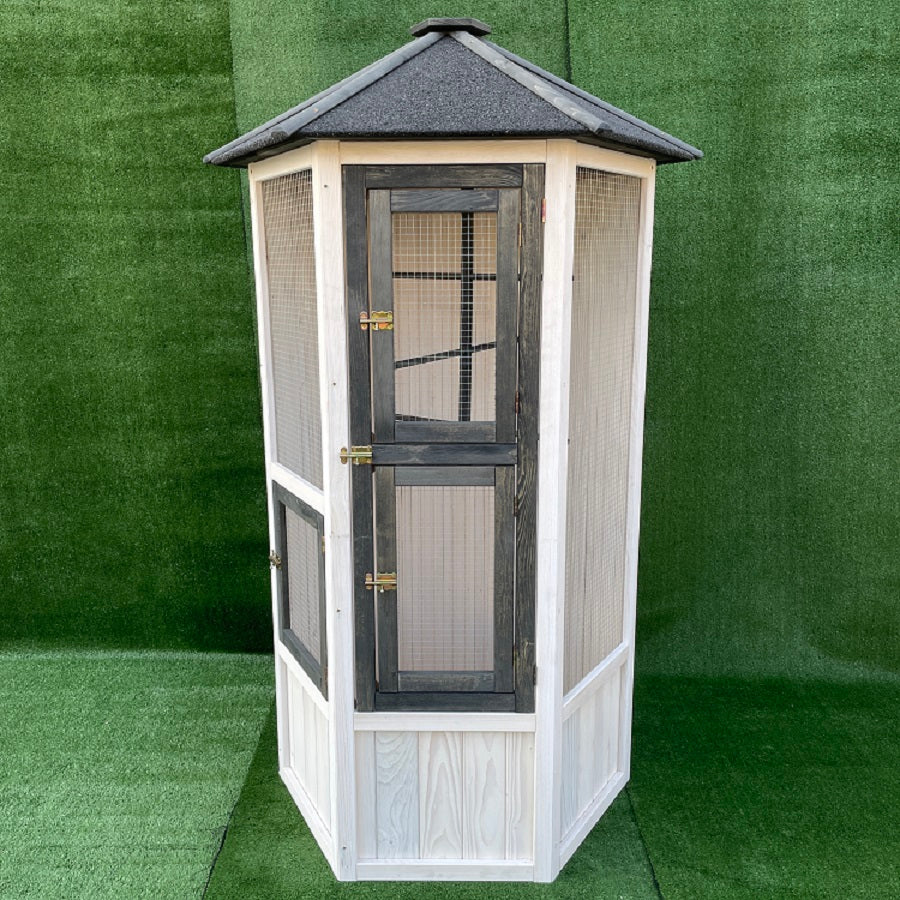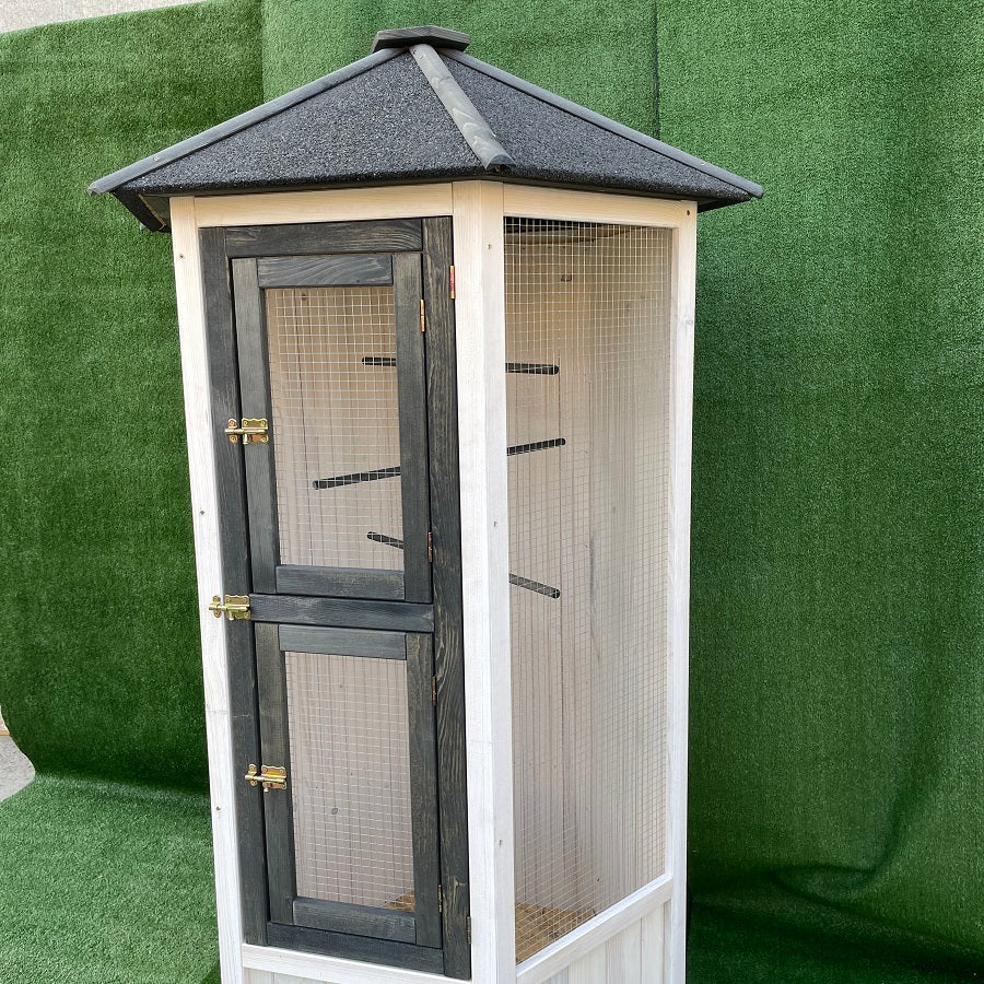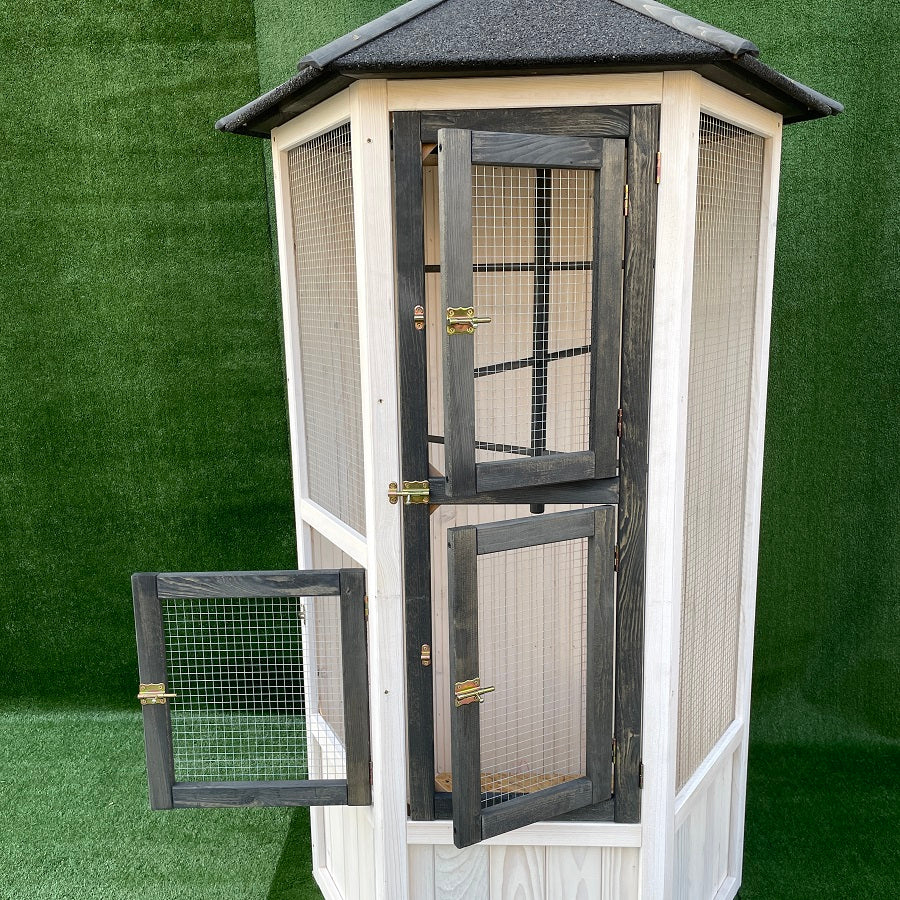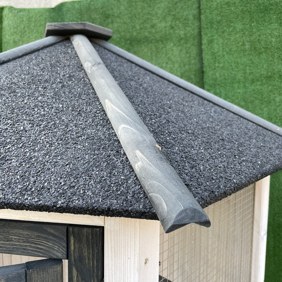 Il Tetto è coperto con Carta Bituminata ed è quindi adatta per resistere all'esterno anche per il fatto che tre delle sei facce della gabbia per uccelli sono completamente in legno, anche la parte a terra è completamente in legno per dare eventuale riparo in più agli animali. Questo vi permetterà di difendere gli animali dal vento